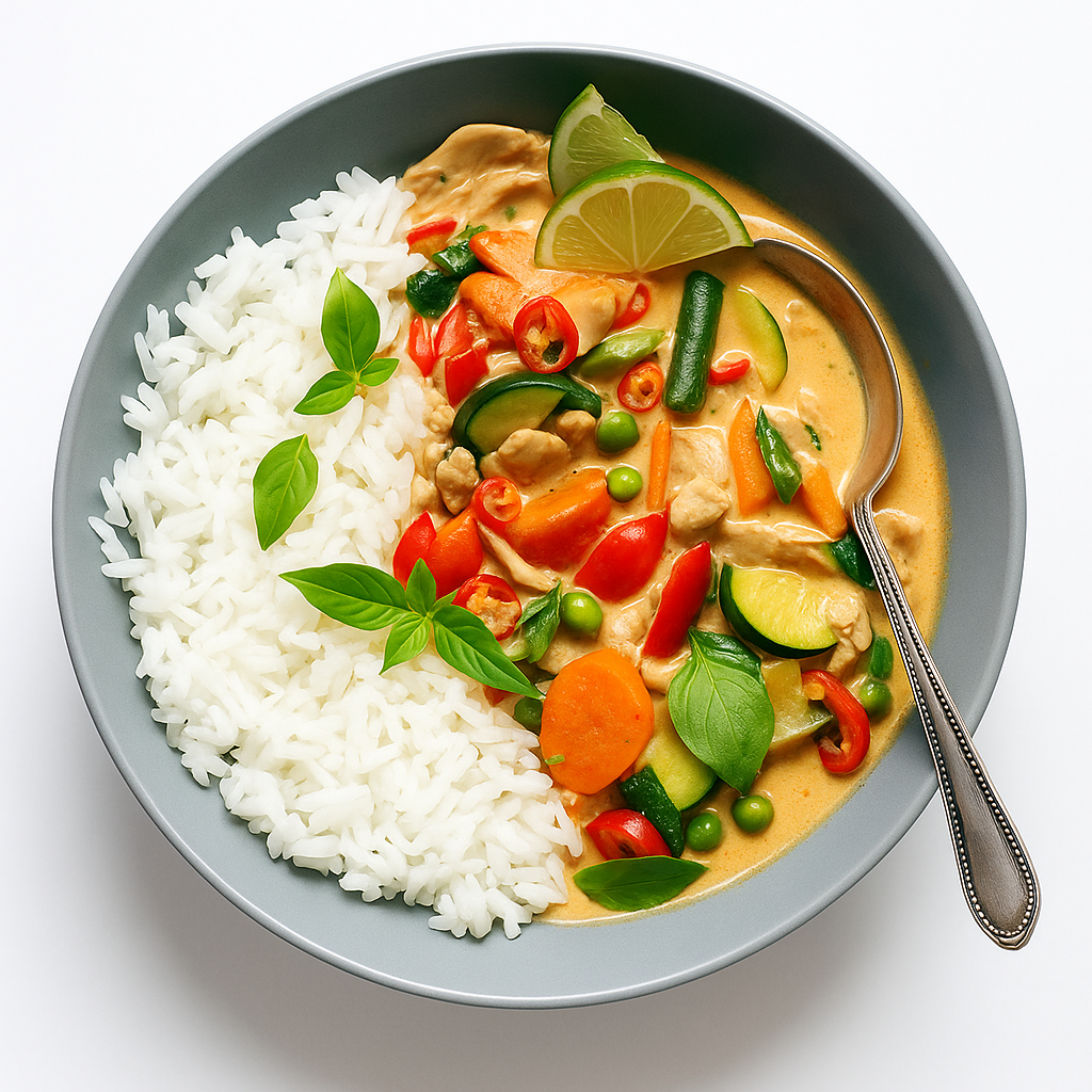 Rotes Curry – aromatisches Curry mit Kokosmilch, Karotten, Bohnen und frischem Basilikum, serviert mit duftendem Reis. Kräftig im Geschmack und angenehm scharf – ein echter Klassiker der thailändischen Küche.