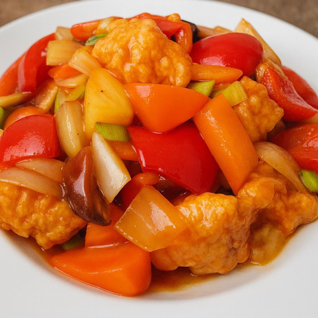Süss-Sauer – ein asiatischer Klassiker mit fruchtig-pikanter Sauce. Serviert mit frischem Gemüse und duftendem Reis – die perfekte Balance zwischen süss und würzig.