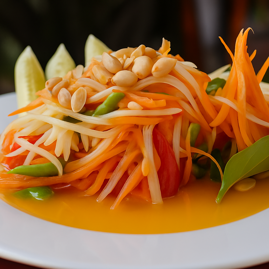 Knackig, frisch und aromatisch: Som Tam – ein thailändischer Papaya-Karottensalat mit einer leichten Schärfe, gerösteten Erdnüssen und spritzigem Zitronensaft. Ein echter Klassiker aus der asiatisch